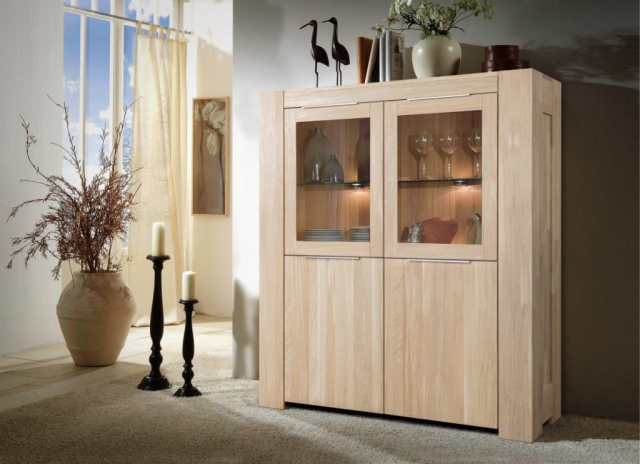 - ▹ Фасады: массив дуба, с вариантами дополнения стеклянными элементами.